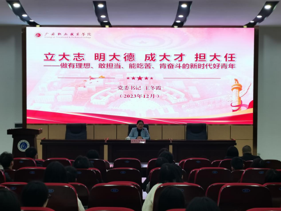 12月13日上午9点30分,校党委书记王冬霞在明德楼希贤厅为2021级电子商务1班和2班学生讲授了一堂题为“立大志、明大德、成大才、担大任”的专题思政课。校党政办、马克思主义学院等部分老师参加了学习。