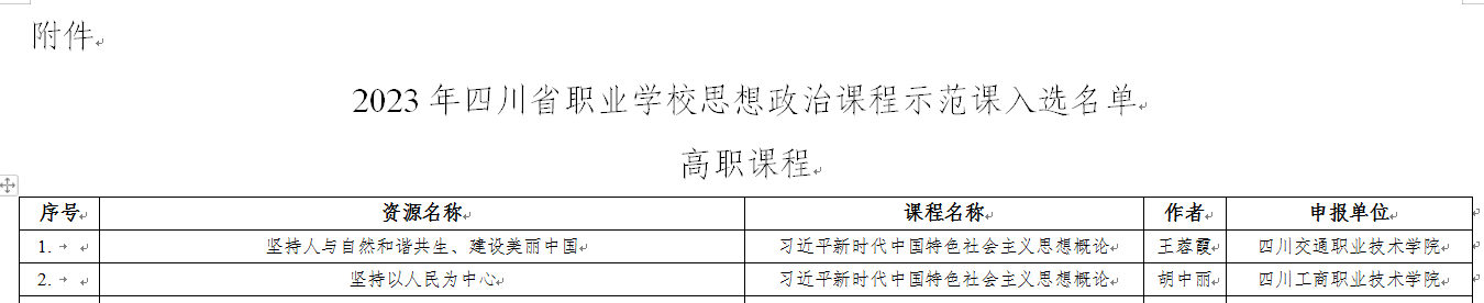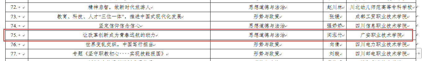 近日,四川省教育厅公布了拟入选2023年四川省职业学校思想政治课程示范课名单,我校马克思主义学院思政课教师闫泓竹的思政课《让改革创新成为青春远航的动力》成功入选。